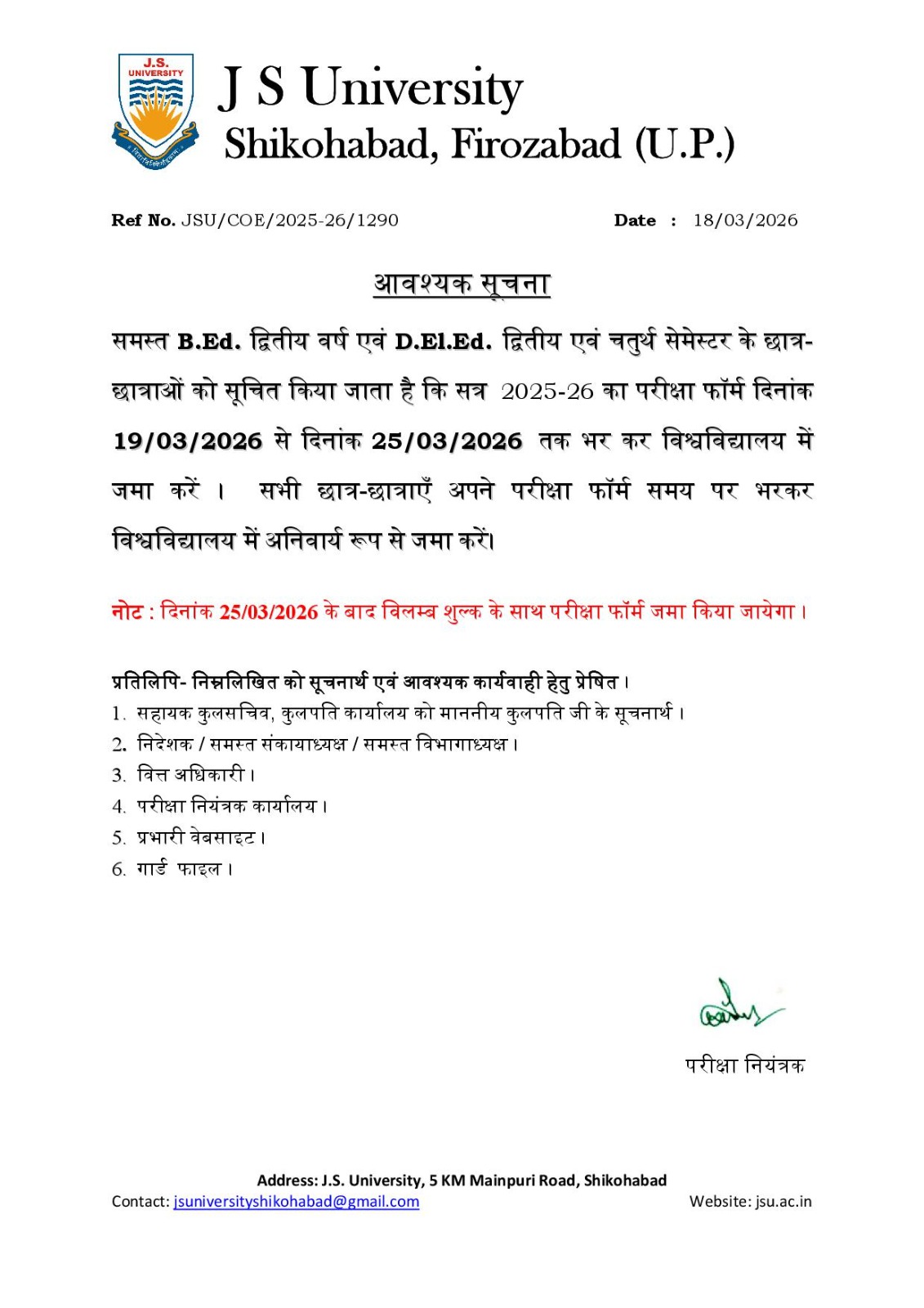 | 12 | All students of Technical and Professional Courses are hereby informed that the last date for submission of Examination Form for the session 2025–26 Even Semester is hereby notified. This notice applies to the following courses: B.A.,B.Sc, B.Com, M.A., M.Sc. M.Com, Diploma, B.Tech, B.Pharm, BBA, BCA, B.Sc. (Agriculture), M.Sc. (Ag.) (Agronomy & Horticulture), MBA, M.Tech, MCA, LL.B., B.A. LL.B., B.Sc. B.Ed., B.A. B.Ed., M.Ed., LL.M., and B.Lib, PGDCA, PG Diploma in Yoga | View |